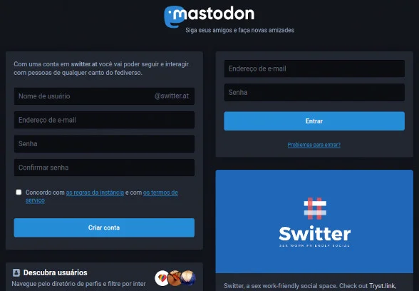 Há também uma nova plataforma, a Switter.at , que é sex-worker-friendly, criada por uma profissional do sexo, e que está hospedada atualmente na Austrália. Funciona como um “Twitter à prova de SESTA / FOSTA” e tem ferramentas muito interessantes, como habilitar o perfil para que apenas seguidores “aprovados” vejam o feed, assim como tolerância à nudez e a outros conteúdos análogos a nosso trabalho. Ainda é incerto o quanto ter uma conta no Switter é legalmente menos arriscado do que no Twitter, mas ainda assim é uma plataforma que, ela mesma, não banirá usuários por conta de sua profissão. Mais sobre o Switter no site YNOT Cam.