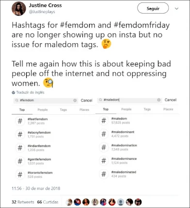 “Hashtags para #femdom (dominação feminina) #femdomdriday não mais aparecem no Instagram mas sem problemas com as tags de dominação masculina.